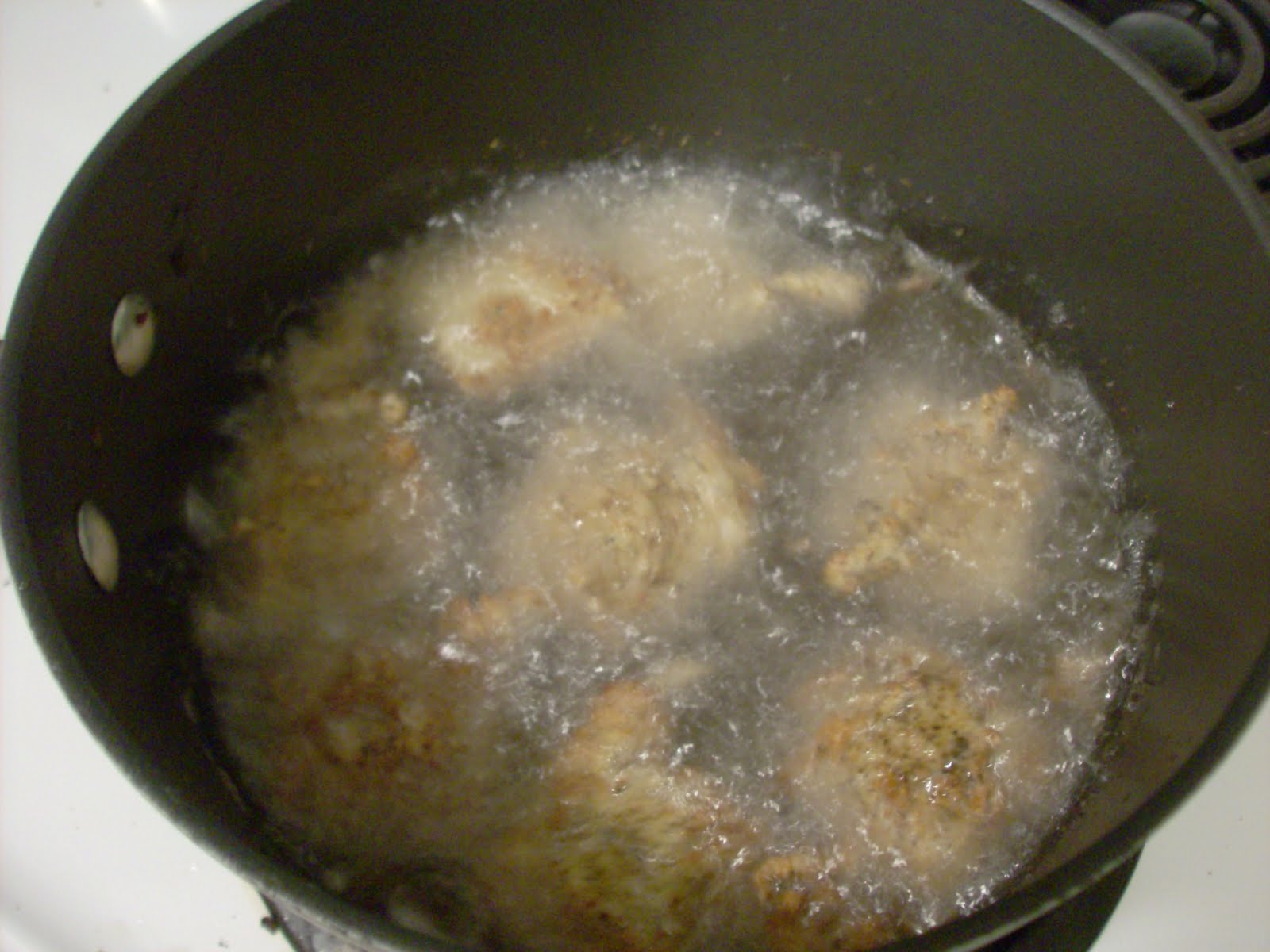 Place your oil in a large pot and heat. When working with oil you need to be careful not to get it too hot or it will burn the food pretty much on contact (trust me I know from experience!), so try turning it on med-low and when you think it may be hot enough try one piece of ravioli at a time in case it's not ready. If it burns on contact your oil is too hot and you need to turn it down, if it doesn't seem to make a fizzle when you put in the ravioli then you probably need to turn your heat up a little. Like hubby told me, it's better to have to turn the heat up and cook the food a little longer than having it burn right away. (That hubby, always gives good advice)